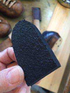 ビスをはずし、穴に竹のようなものをつめ、カカトのサイズにあわせてゴムに銀ペンで印をつけ、ハサミでカットし、大きなブラインダーで80番手くらいので磨耗して形を整える。