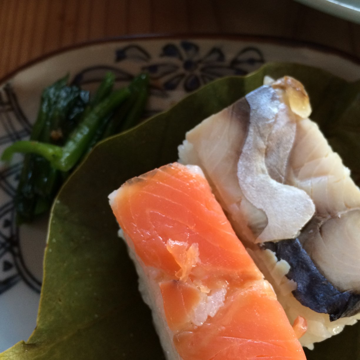 お昼はお弁当にしてもらって、私は押しずしをしました。柿の葉は京都に行ったときの柿の葉寿司の再利用。香りが良いです。