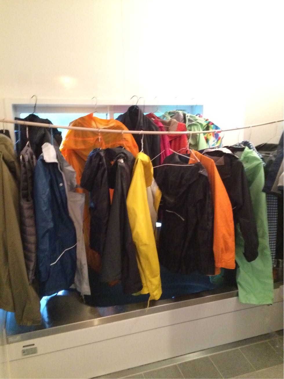 雨が降って雨具が濡れているので風呂場の窓から雨具を預かり、かけました。即席のクローク。
