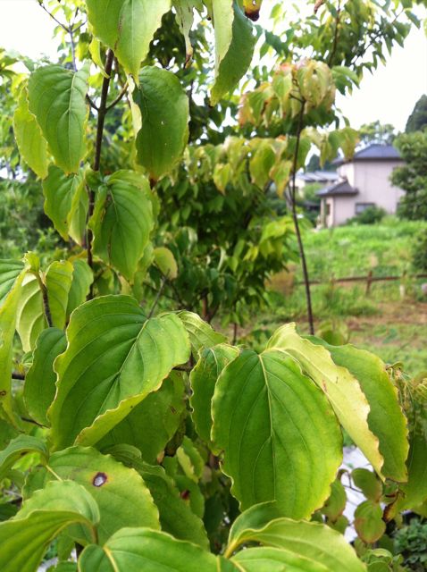 朝、デッキで気功をしていたら目の前のヤマボウシの葉の上にハチが横たわっていた。