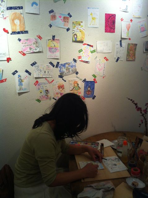 地下の画廊で企画展。月光荘の絵の具や色鉛筆を試せる絵はがきのワークショップをしていて、集まりの時間まで絵を描いて時間をすごした。