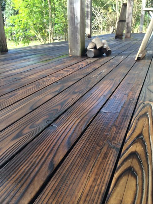 風呂掃除用に買ったブラシでデッキを磨いてみる。5年分の垢落とし。なんだか落ち葉もあって泥も糞もついて濁って見えたから突然磨いてみたくなった。お日様も出てくる予報だし、井戸水を出しっぱなしで磨く。