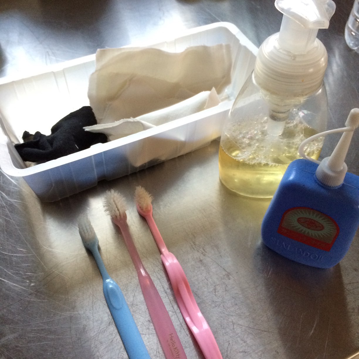 用意したもの、ミシン油、薄めた洗剤森のなかま、ぼろきれ、古歯ブラシ。