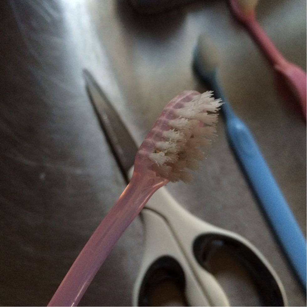 古い歯ブラシの先が開いているのは先端をハサミでカットすると力が垂直に入るから磨きやすそう。
