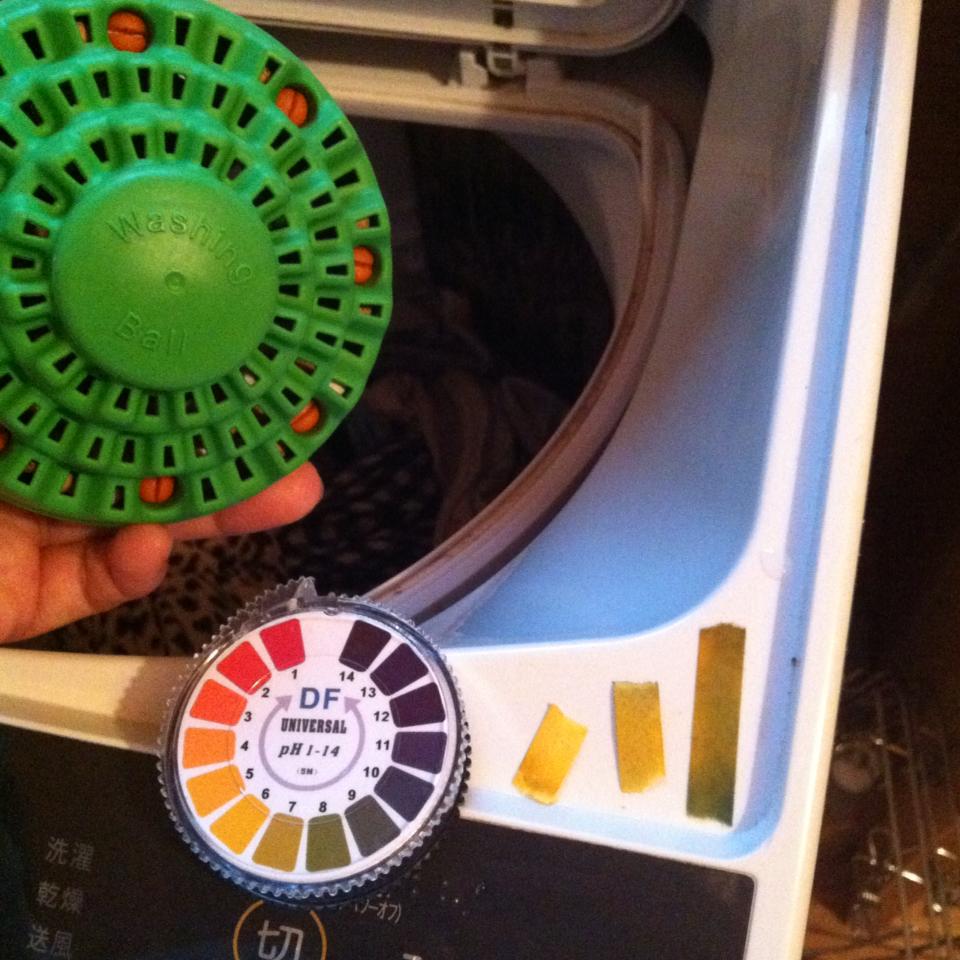 本当?とリトマス紙。右から水、投入後攪拌5分、すすぎ直前の水。たしかにpH価が上がってアルカリ性を示している。