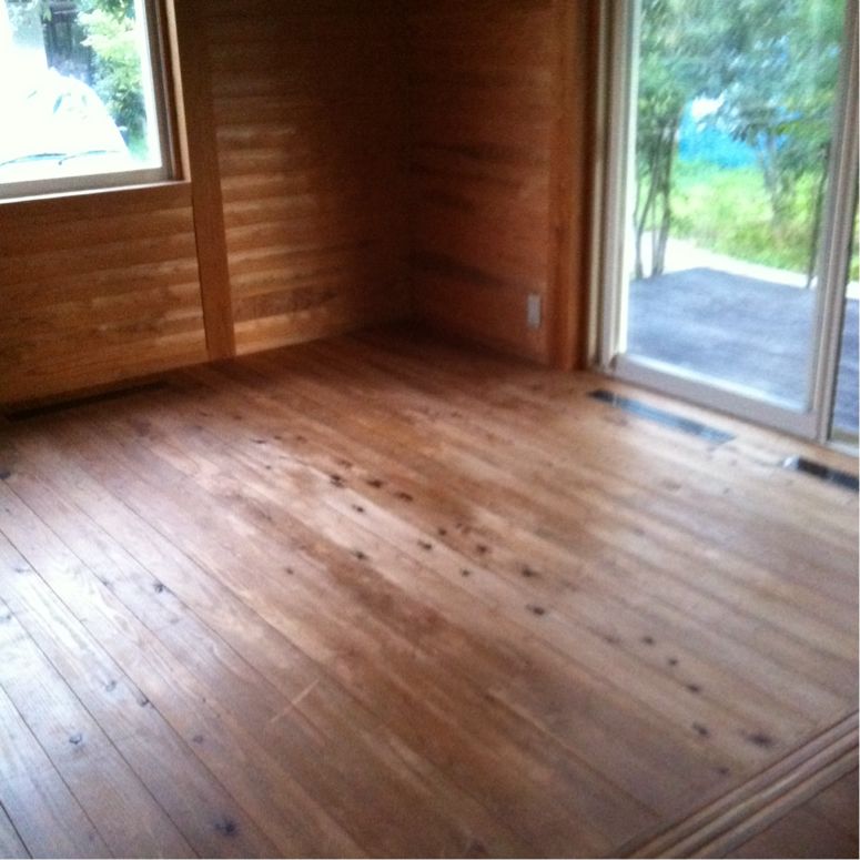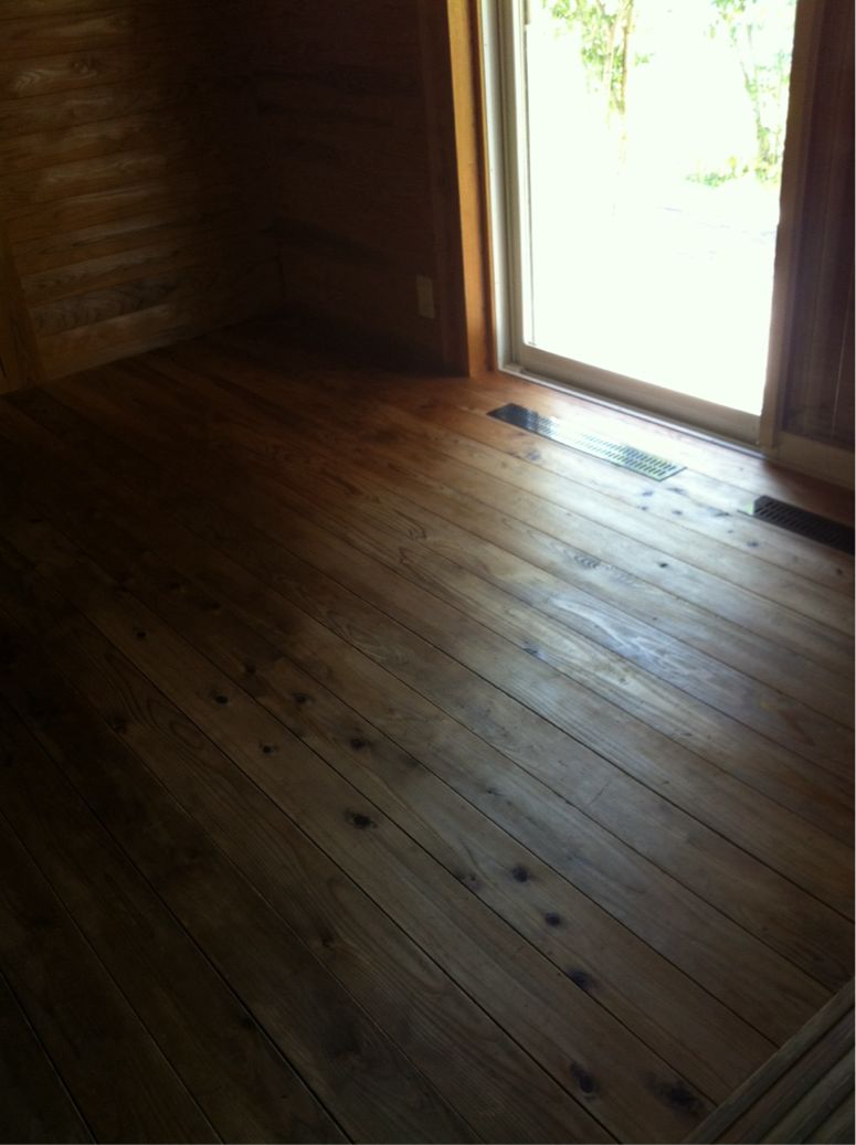窓から板で数枚くらいを雑巾にクレイをのせ、定着させるために森のなかま洗剤の泡と水道水で固定し、雑巾がけしたもの。