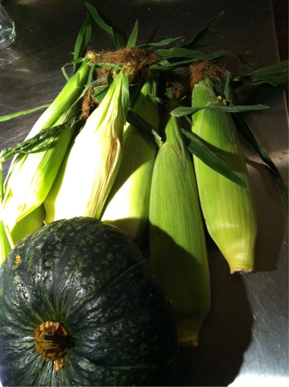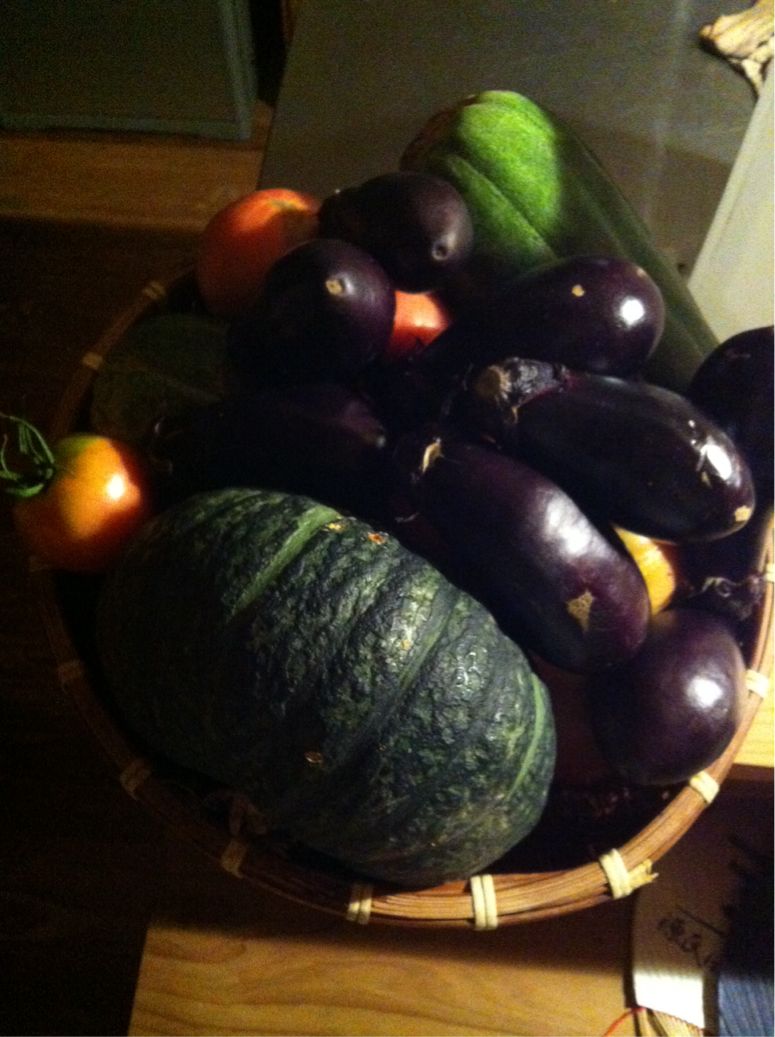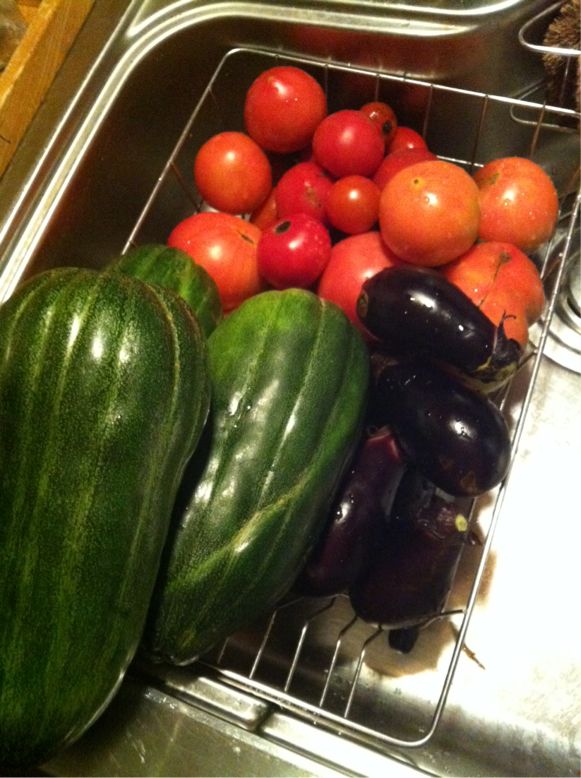 今日は本当に暑い日だった。ご近所の農家さんがシャツには土がついて、汗だくで、山ほど野菜を抱えて。