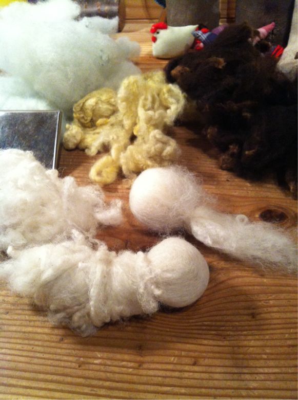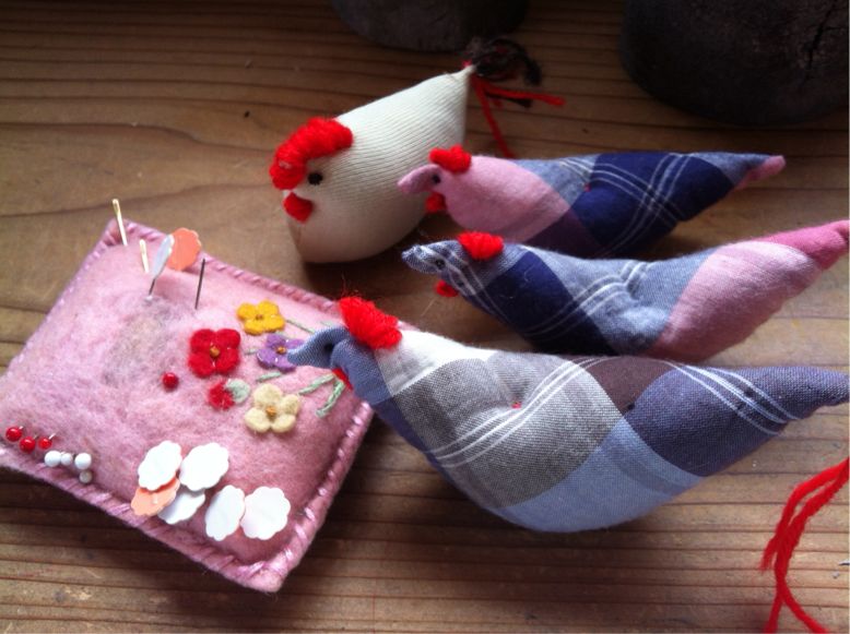 針刺しにと、余ったキレに羊毛の手入れで出てきた端のところや草のついたところを入れてチャボをかたどった針刺しを作ってあった。だれにもあげないままにそのままに。油脂の残った手洗い羊毛の毛は針を錆びさせないかなと。私のは小学校のときに母がつくってくれたもの。中に髪の毛を入れて錆びさせないようにしてあるはず。