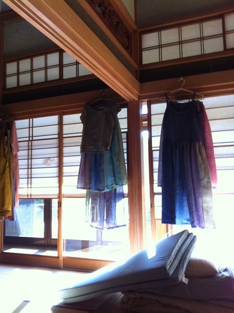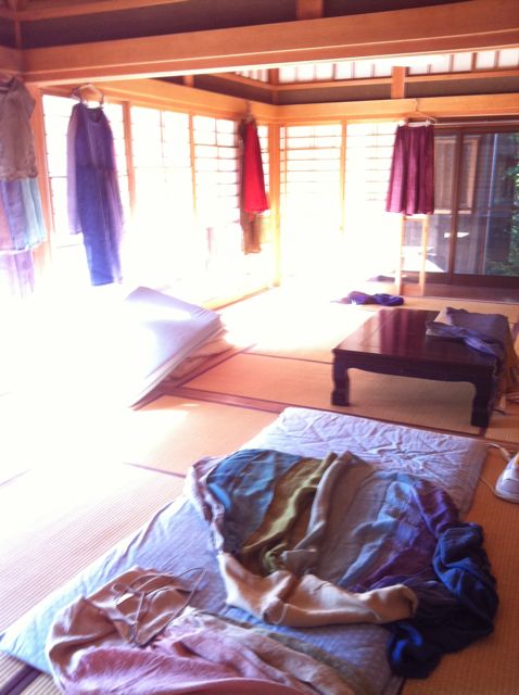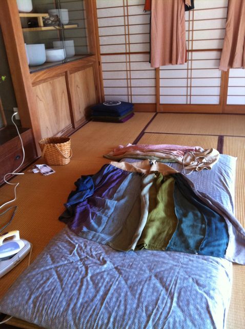朝の光が障子から差し込んで、今回、蔵でないところで売れる前の商品ほとんどたくさんこんなに見られたのは世の中で私だけ。とにかくどうやってこの色出すんだろう?という関心と、ここはこうやって縫ってるのか、きれいだなあ。と感心してばかり。