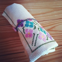 ならば袋くらいは用意してあげよう、とクロスステッチの布は私の小学校時代のものを取り出して刺繍してみた。