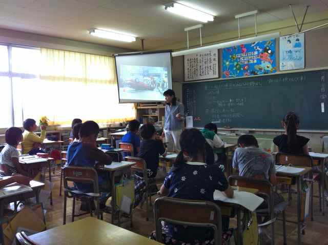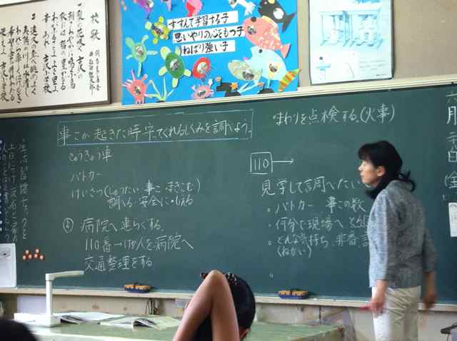 つぎつぎに挙手をした子供たちが「車が転がっている」「窓がわれている」「消防車がきてる」「救急車が見える」「警察官がいる」など答えて行きます。