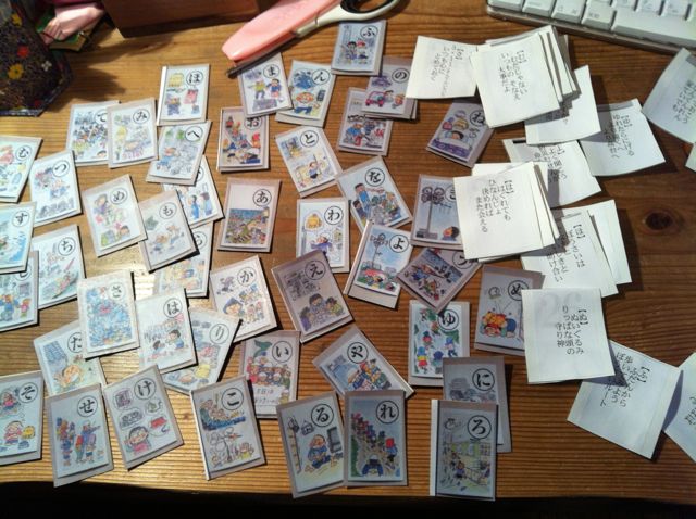 出場することになった娘に学校からカラーコピーが渡された。学校で練習をする暇はないので家で見なさいね、という事だと思う。それを厚紙を貼って6センチ4センチに切り取って。それから読み札は使わなくなったカレンダーに張り付けて切り取った。