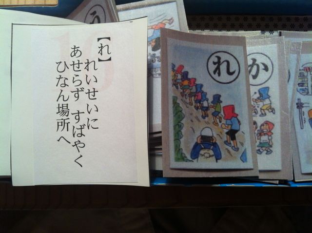 地域の防災カルタ。これは小中学生からあつめた防災に関する標語を選んでそれに漫画家車だん吉さんが絵を描いたもの。去年作成されたそうだ。