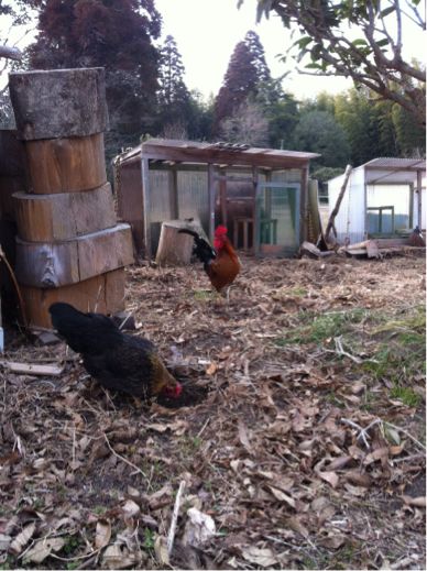 こちらが卵を横取りされたとは知らずに餌をついばむ昨年春に産まれたチャボ。昨日から合計で8つの卵を拾った。