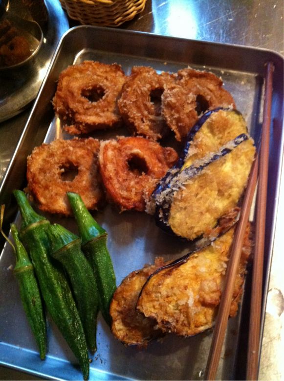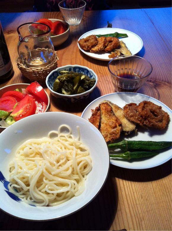 、と車麩を煮てパン粉をつけてフライ。残った生地に茄子もフライ。ここまで車で送ってきてくれた友達のおばあちゃんにいただいたオクラも油が熱いうちに素揚げ。