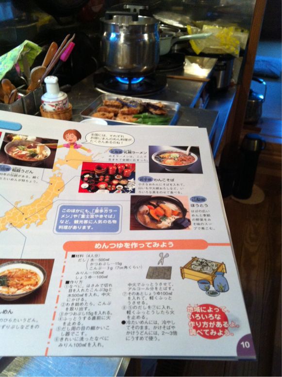 家にもどってから学校で配布された麺の本に載っていたレシピの麺つゆを子どもと作り、うどんを茹で、サラダを盛り付けしてもらい、夕ご飯にしました、