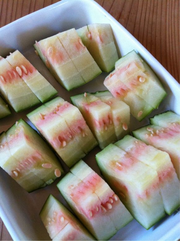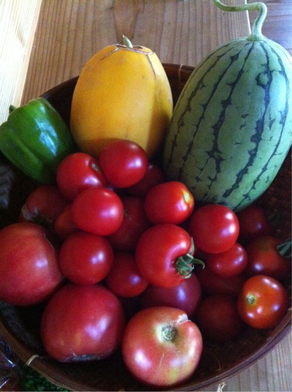 スイカは出来たらどうぞと言われていつ頃だろ?と見に行ったら一つのスイカは動物に食べられていた。中がもう赤い。なので慌てて収穫。