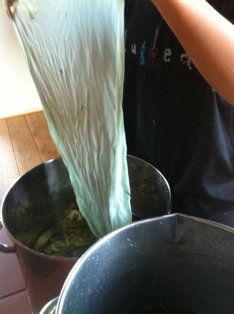 しっかり色がつきました。毛糸はもともとタンポポで染めて黄色だった上に重ねました。