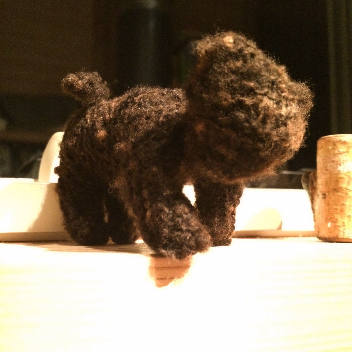 で、編みぐるみの中に詰めてみた。最初はお手玉にしようとおもったけど、あった糸が黒くて編んでいる途中でクマにしようと思って、さらに編んでいて、そうだ、もらった人がくろねこ舎というお店の名前だからネコにしてあげようとおもってネコにした。