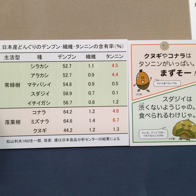 マテバシイやトチノミを粉にして、水で何日もさらして食べる地域もあるそうでそうした処理の紹介や商品となっている紹介もしてあった。韓国ではドングリの粉がスーパーに片栗粉と並んでおいてあるという紹介もあった。